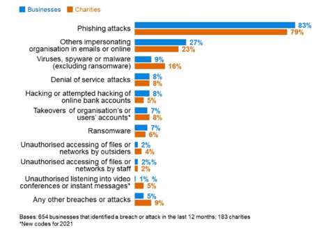 When this question was first asked, back in 2017, direct malware was more prevalent. But overtime this has been knocked off it’s top spot by phishing and impersonation attempts. Between 2017 and 2021, phishing attacks have risen from 72% to 83%.